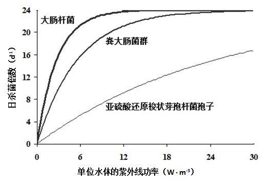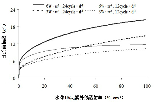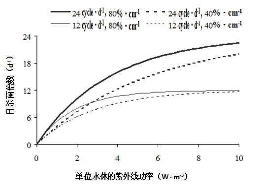 (1)在一個(gè)循環(huán)水系統(tǒng)中,紫外線輸入功率、循環(huán)水流速和水的UV254的透射率是影響紫外線殺菌效果的3個(gè)重要因素。單位水體的紫外線功率越大,殺菌效果越好;水體通過紫外燈殺菌器的流速越大,總殺菌效果加大;UV254透射率越大,殺菌效果越好;