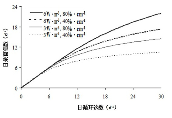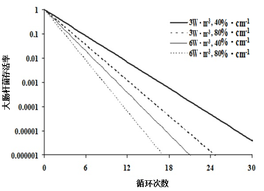 (3)不同失活速率常數(shù)的菌種,對于失活速率常數(shù)較小的微生物,增大紫外線功率比增加日循環(huán)次數(shù)更為有效。對于失活速率較大的微生物,前期增大紫外線功率取得較好的殺菌結(jié)果,后期則增大日循環(huán)次數(shù)更有效。
